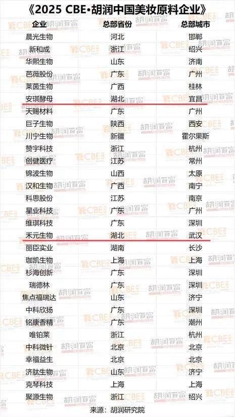 湖北日报讯(记者肖丽琼、实习生彭馨仪、赵尹)8月11日,《2025 CBE・胡润中国美妆原料企业》发布,榜单聚焦美妆行业上游的原料生产及研发领域,评选出30家标杆企业,湖北安琪酵母、禾元生物跻身榜单。