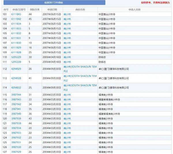 据中国商标网信息,嵩山少林寺先后申请注册“东少林”、“西少林”、“南少林”、“北少林”等商标,且几乎是全类注册。