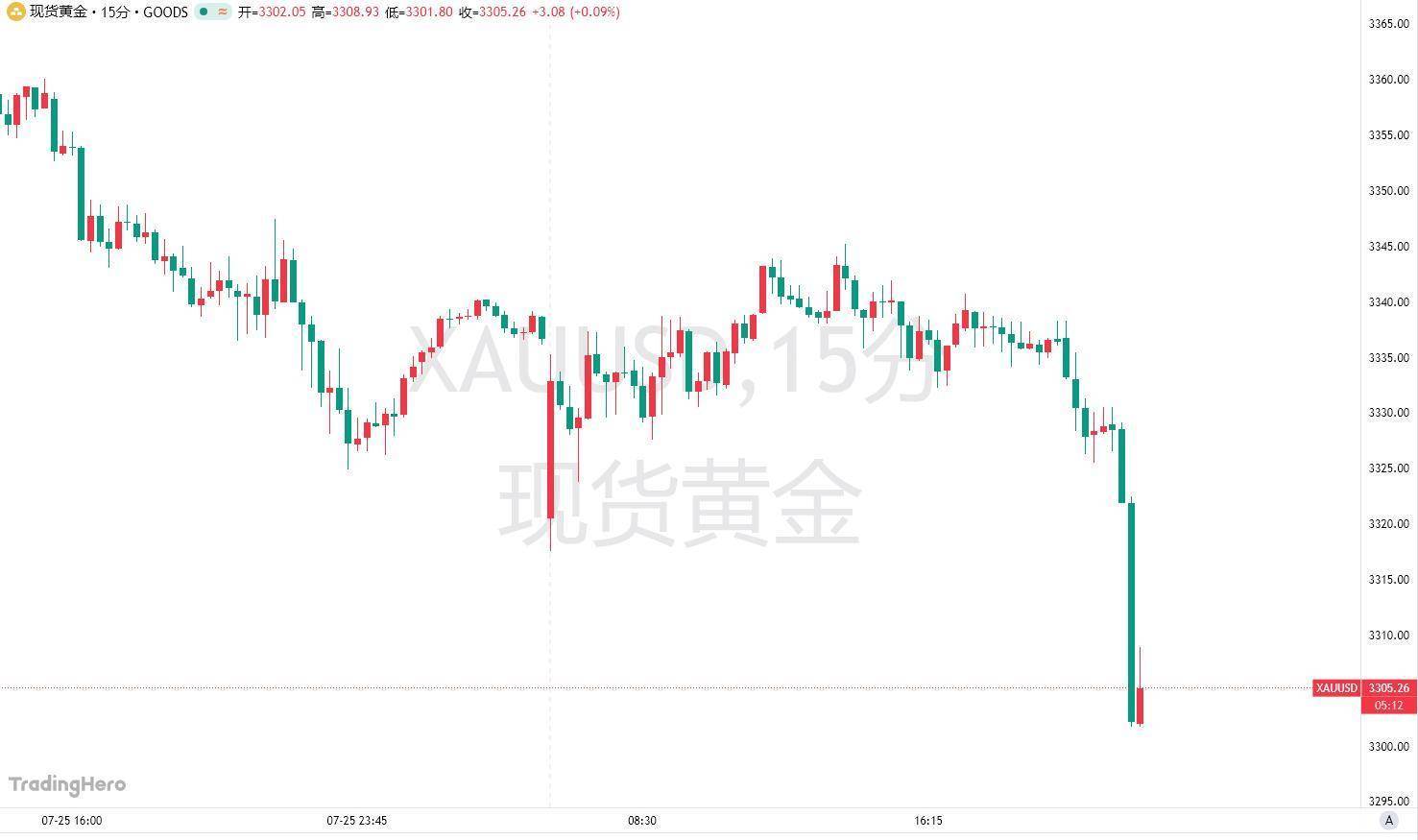 因美国和欧盟宣布达成一项关税协议,避免了人们对这两个经济体之间可能爆发痛苦贸易战的部分担忧。黄金价格周一大幅下跌,并在美盘前一度跌至3300美元的大关。